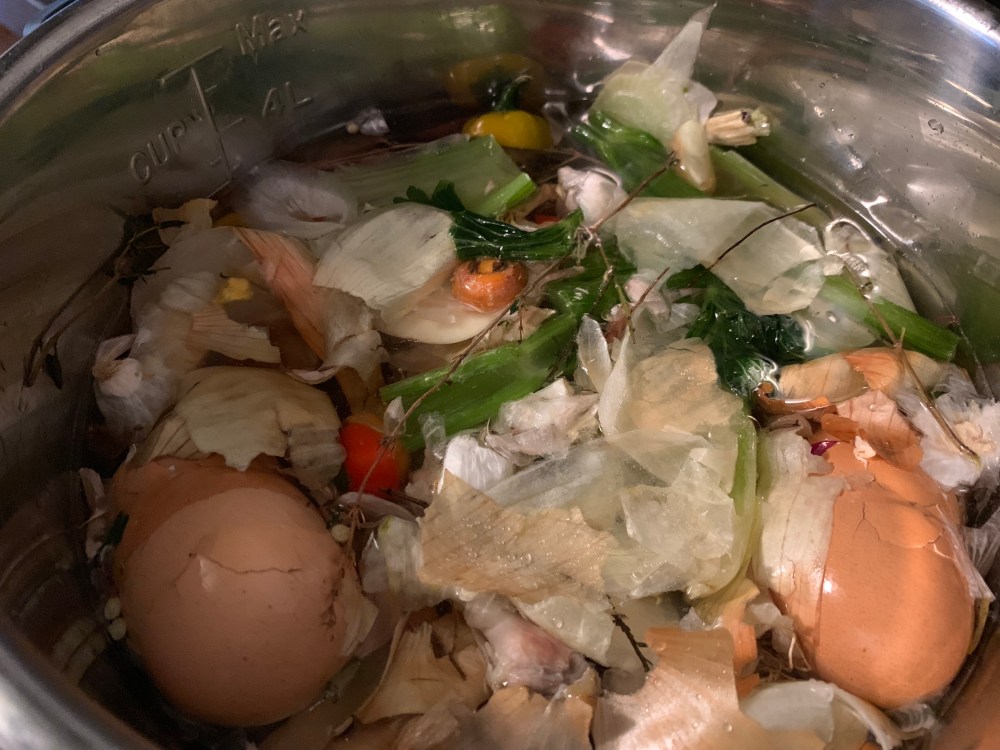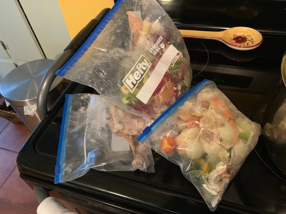To make my broth, I save and freeze the clean ends of carrots, parsnips, celery, onions, too tiny to peel cloves of garlic, herb stems and even eggshells and along with any bones from home cooked meals.