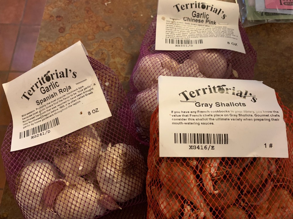 Not wanting to have a repeat of those mistakes, this year I ordered from Territorial Seed. Two hardneck varieties, Spanish Roja, which I’ve seen specifically featured in some specialty produce markets, and Chinese Pink, which has a reputation for an early harvest. As an added bonus, I got some true French gray shallots to try as well!
