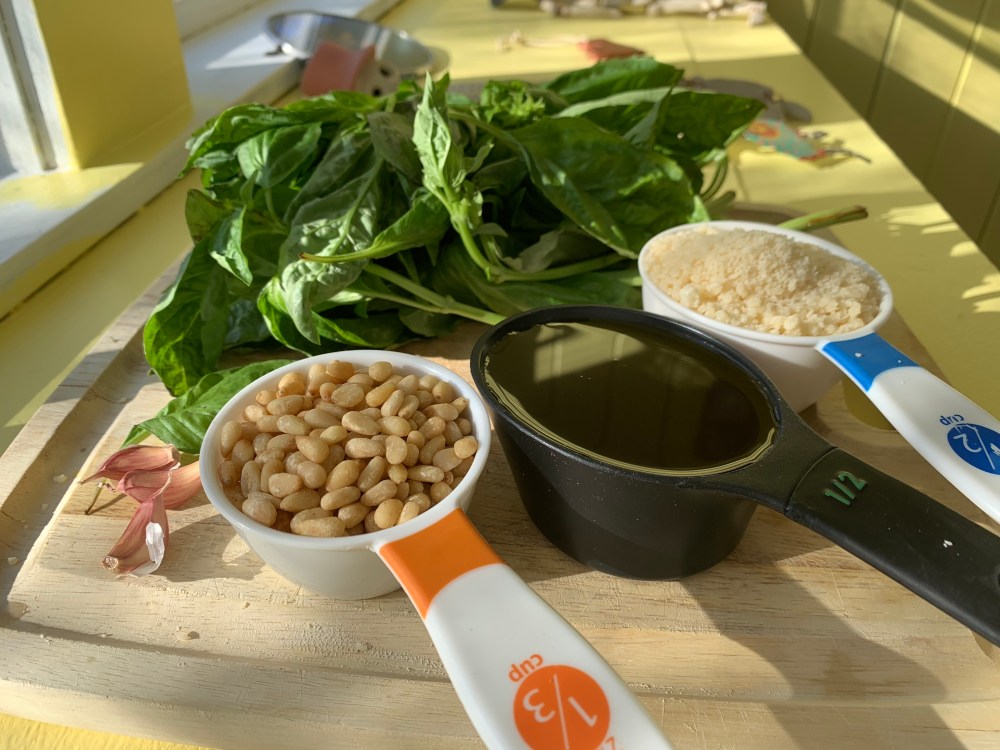 It’s 2 cups of basil leaves, 3 cloves of garlic, 1/2 cup Parmesan cheese, 1/2 cup of extra virgin olive oil, and 1/3 cup of pine nuts. Plus 1/4 teaspoons salt and 1/8 teaspoon of pepper.