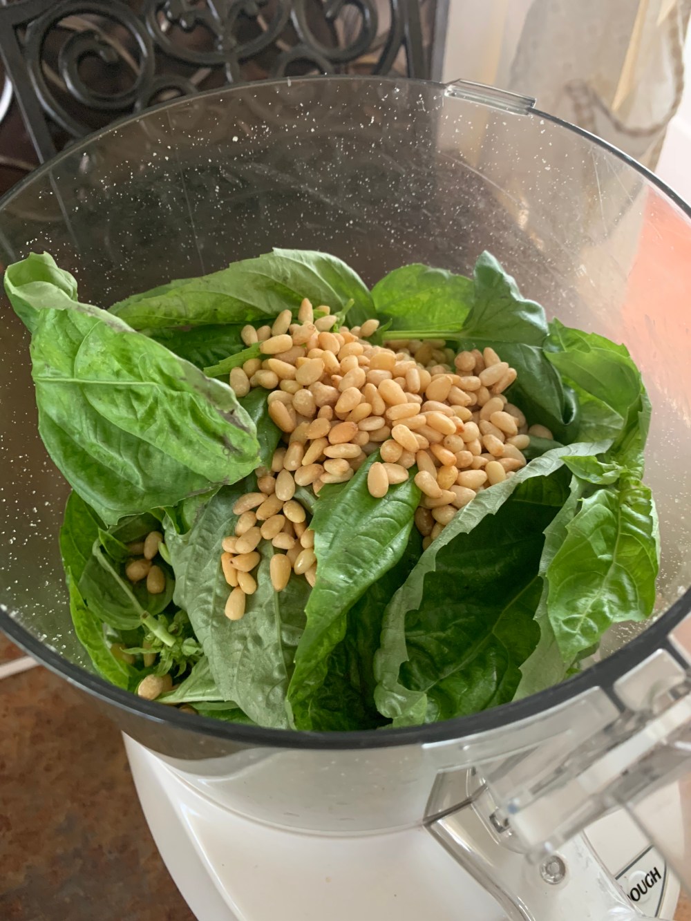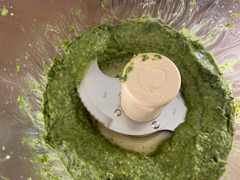 Pesto is a decadent mix of basil, extra virgin olive oil, pine nuts and Parmesan cheese. The recipes call for a lot of oil, so I’ve often made it by feel attempting to use less and then been disappointed. So I followed the proper ratios for this.