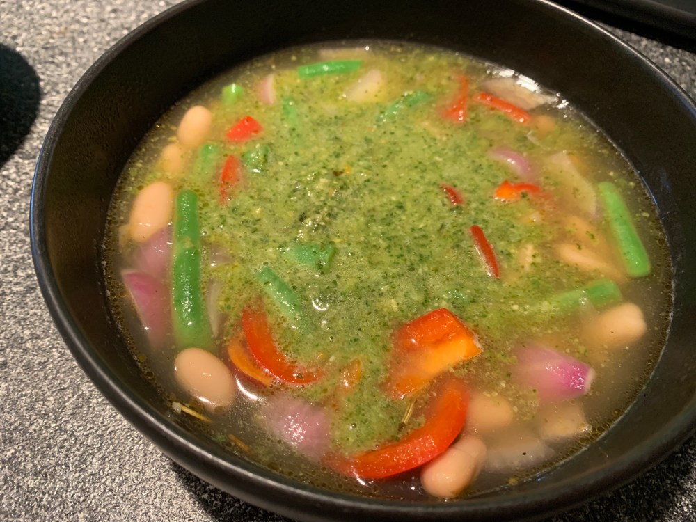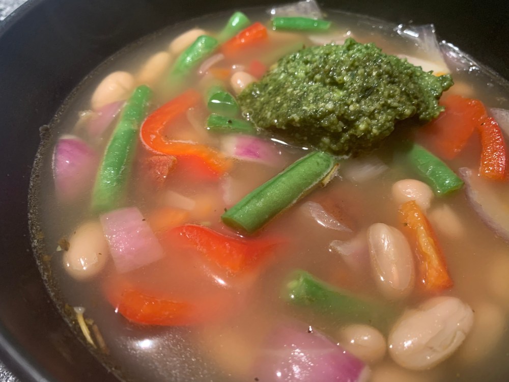 This is onions, red peppers, green beans, carrots and white beans. Add pasta if you like. The basil permeates the broth and makes a plain soup something very special.