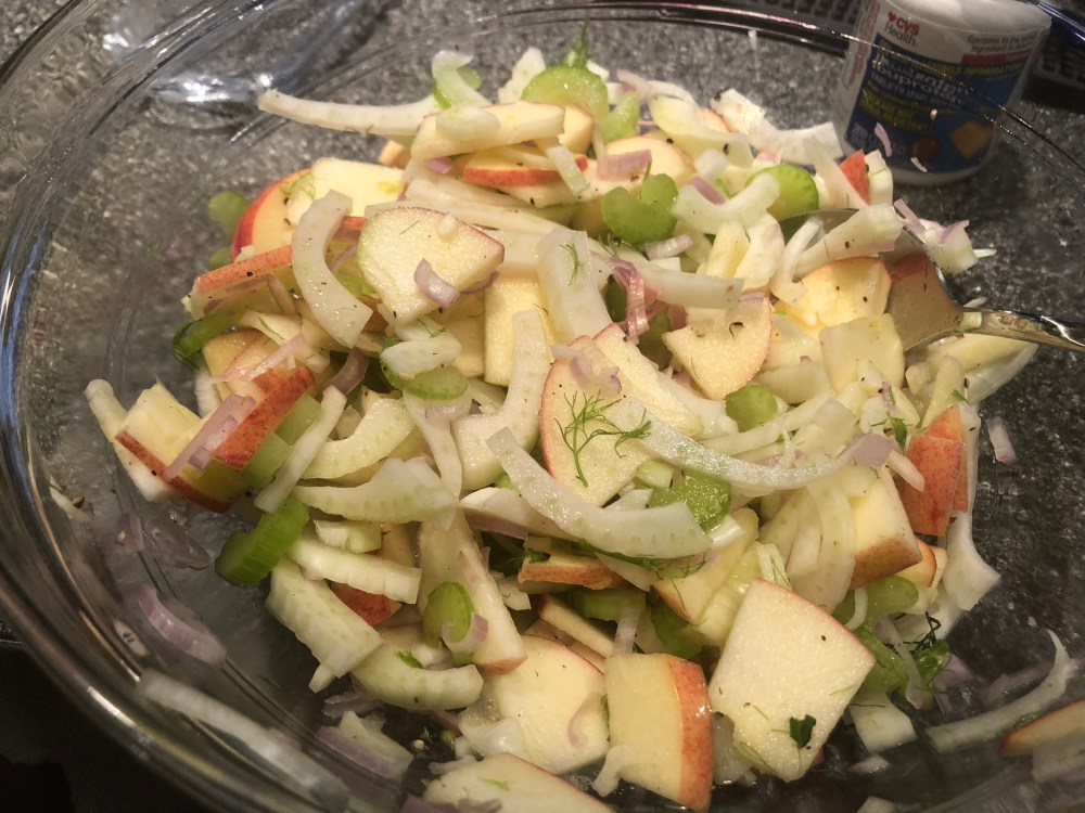 Raw fennel, celery, apple and red onion. Again soak the apple in lemon. I find that I don’t need any further dressing for this combination, but you could add olive oil and walnuts.