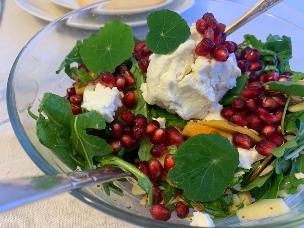 I mimicked a salad from Poppy’s restaurant week menu – this is persimmon, apple, pomegranate, almonds, and goat cheese, mixed with sorrel, arugula, and nasturtium greens. The trick to salads with apple is to soak the cut fruit in lemon juice. That and olive oil, salt and pepper are all the dressing this needs. It’s a wonderful combination of fruit and greens.