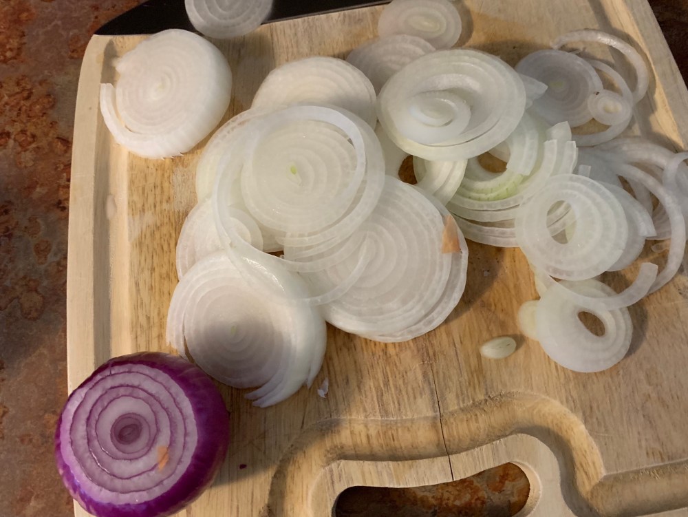 Sauté until the onions brown but don’t burn. I like to use cast iron. Salt and pepper a bit. As the onions begin to brown, if you like, splash a bit of cognac, sherry or red wine to scrape up the brown bits. Then add your broth and a bay leaf and simmer as long as you can stand (so 30 minutes to an hour, but sometimes I just can’t wait and do 15).