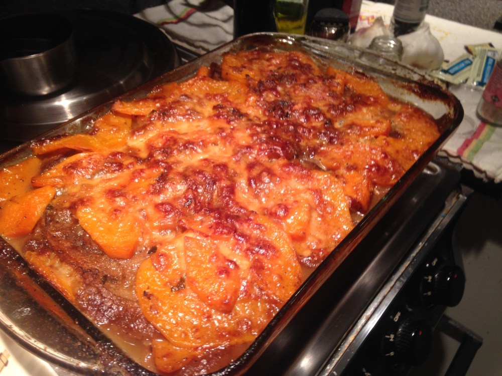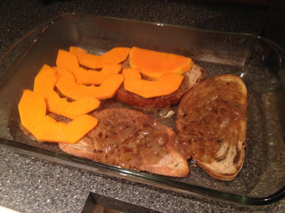 But the basic thing is to thinly slice butternut squash and layer it with day old bread (I recommend rye).