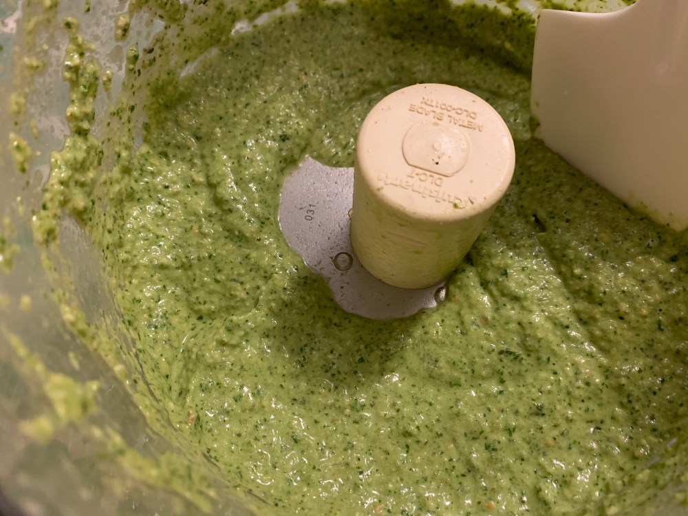 I wanted mine to look bright and be a bit more pesto-like in consistency – also life has gotten busier, so I wasn’t looking for super complicated. Most recipes describe roasting tomatillos and making your own salsa verde. I opted to use pre-made salsa verde from Trader Joe’s instead, making this a breeze.