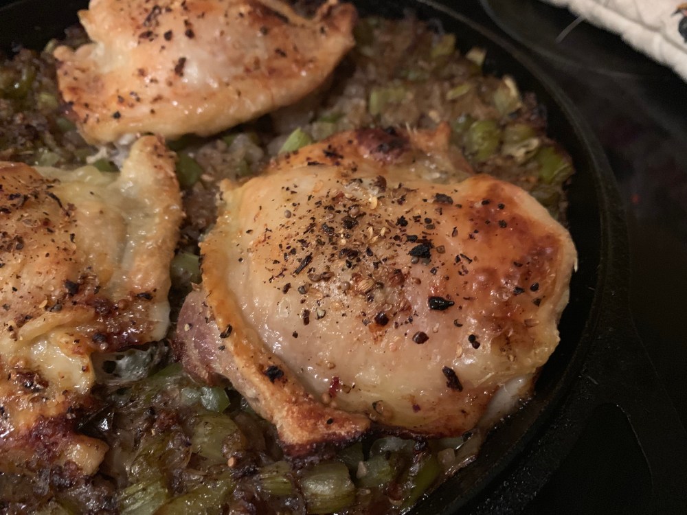 PS this rice is a delicious spin off of green rice, it’s celery, onion and green bell pepper sautéed with rice then topped with beef broth used to make pot roast the day before. It turned out a little darker than I expected because of the rich broth. It was excellent cooked in the oven in cast iron under chicken thighs and the flavor was similar to paella. It even developed a socarrat crust!