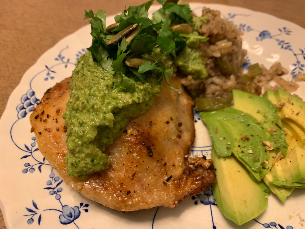 In a food processor, blend one clean and semi-dry bunch of cilantro with one cup of roasted pepitas (green pumpkin seeds without the white hull you see on the ones you get out of your Halloween pumpkin). Then thin the thick paste by blending the full 12 ounce jar of salsa verde. This makes a thicker sauce than what I had in the restaurant, but the flavor is spectacular. You could thin it by using a larger jar of salsa or with broth if you want a saucier sauce.