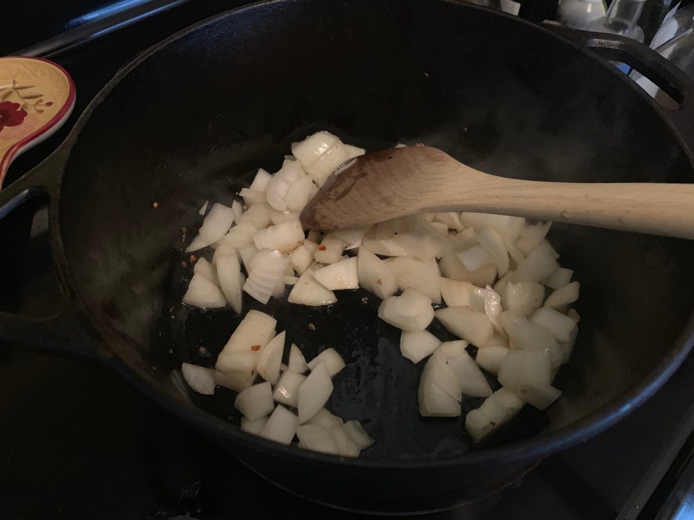 Set your browned meat aside and sauté the onions in the same pan. Once the onions are tender, pour in up to a cup of red wine. I never want to seem to give up this much of the wine I’m serving with dinner, so usually just deglaze the pan with about 1/3 of a cup and call it good. Add the meat to the onion wine mix, add thyme, garlic and bay leaf, then cover with broth, so that the meat is submerged and bake at 350 for 90 minutes.