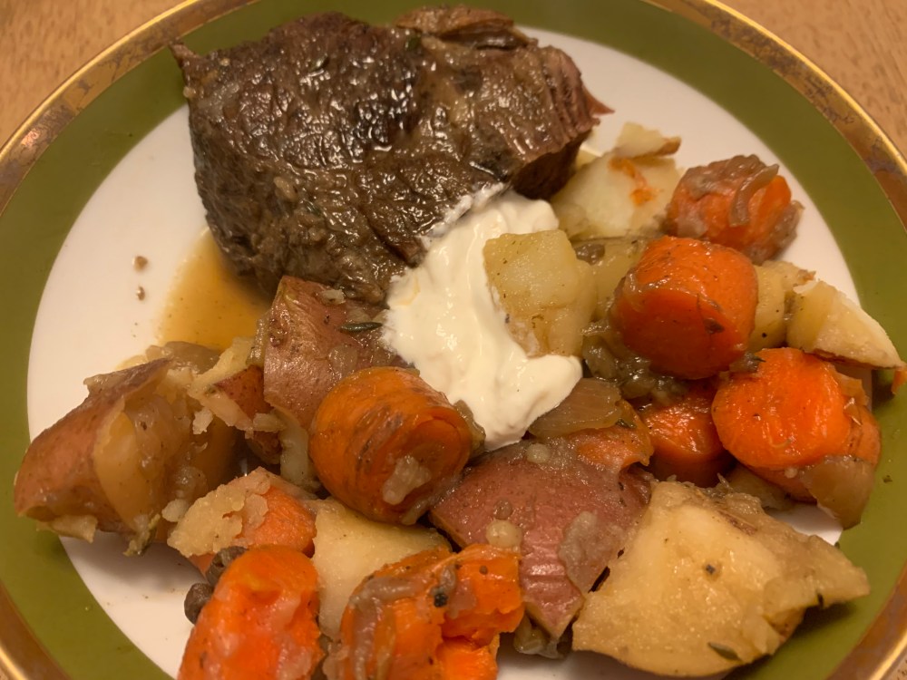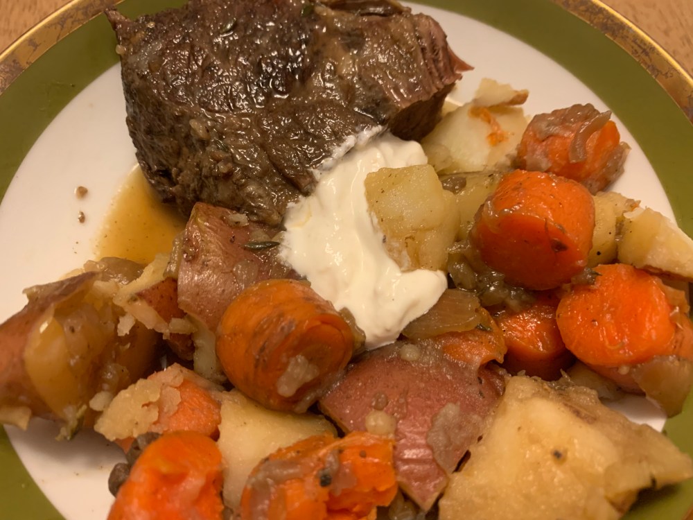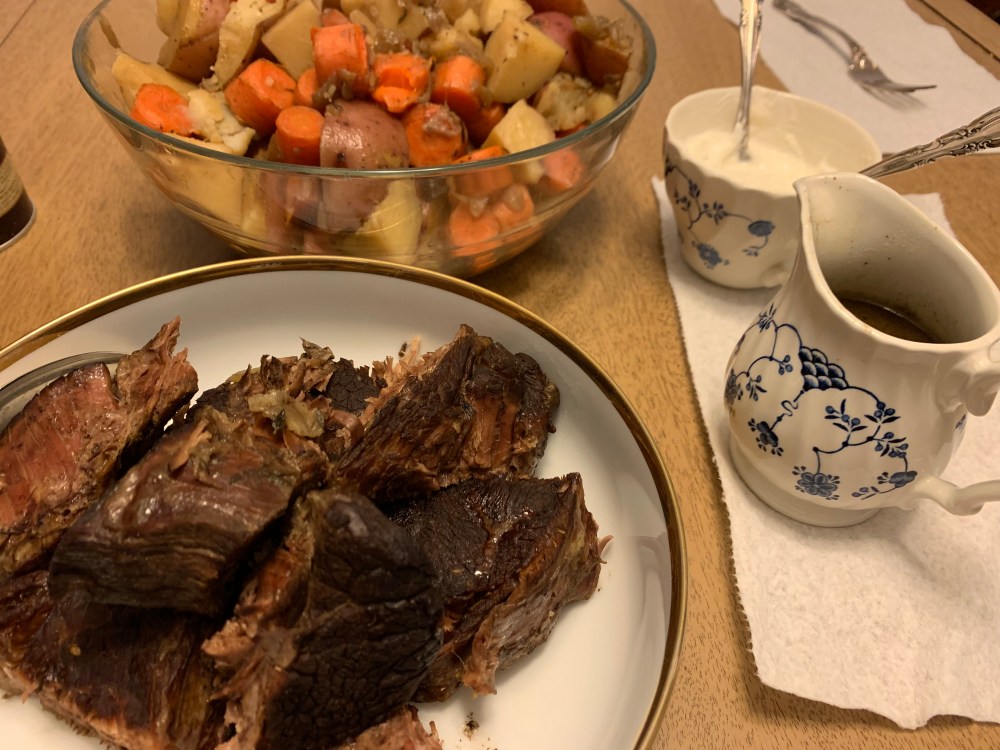 A couple of notes from this, I put my veggies underneath my roast, but in future I’ll do them on top so the meat stays submerged. I had a three pound bag of potatoes and used them all. Which was not proportional at all to the meat I had, but I used the leftovers for a nice hash topped with a fried egg.