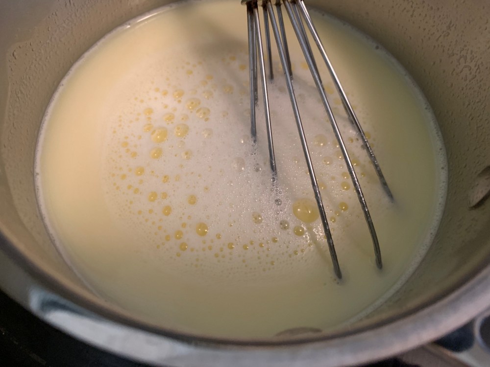 In a small saucepan, heat the milk, add the sugar and whisk to dissolve, then add the stick of butter to melt in the mixture.
