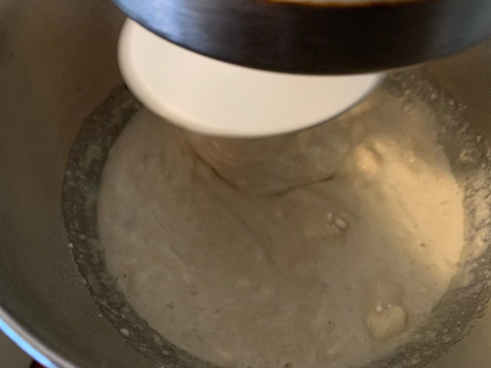 Next move the yeasty liquid to a bowl. I put mine in my stand mixture with a dough hook attachment. Gradually, add two cups flour, the salt and cardamom, and one egg. Mix well.