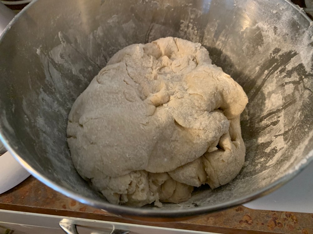 Gradually add three more cups of flour. Mixing one at a time into the dough ball. I found I’d have to flip it over to fully incorporate all the flour. If your dough is still sticky, slowly add the last cup of flour.