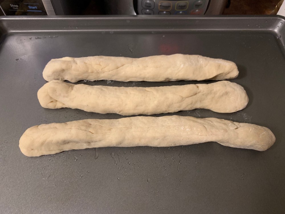 Transfer the dough to an oiled bowl, cover it with plastic and let it rise for at least an hour. When you are ready to proceed, move the dough to a floured surface and knead it a bit. Let it rest while you prep your baking pans.