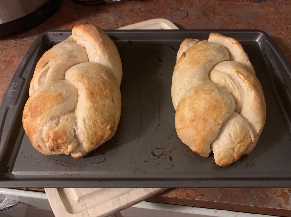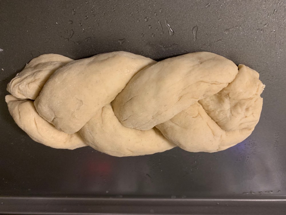I wanted to do a trial loaf and was too lazy to do the egg wash with sugar pearls (which is a sugar crystal customarily put on top of cardamom bread), so I brushed watered down honey on this loaf. Since the recipe was for two loaves instead of three, I started checking the bread at 15 minutes, but I found it needed a full 20 minutes. The result was excellent, but I wanted a tiny bit more cardamom flavor so for my final two loaves I added 1/4 teaspoon of cardamom to a beaten egg and brushed that over the bread and dusted it with plain white sugar. This didn’t have the dazzle of the sugar pearls, but it tasted spectacular.