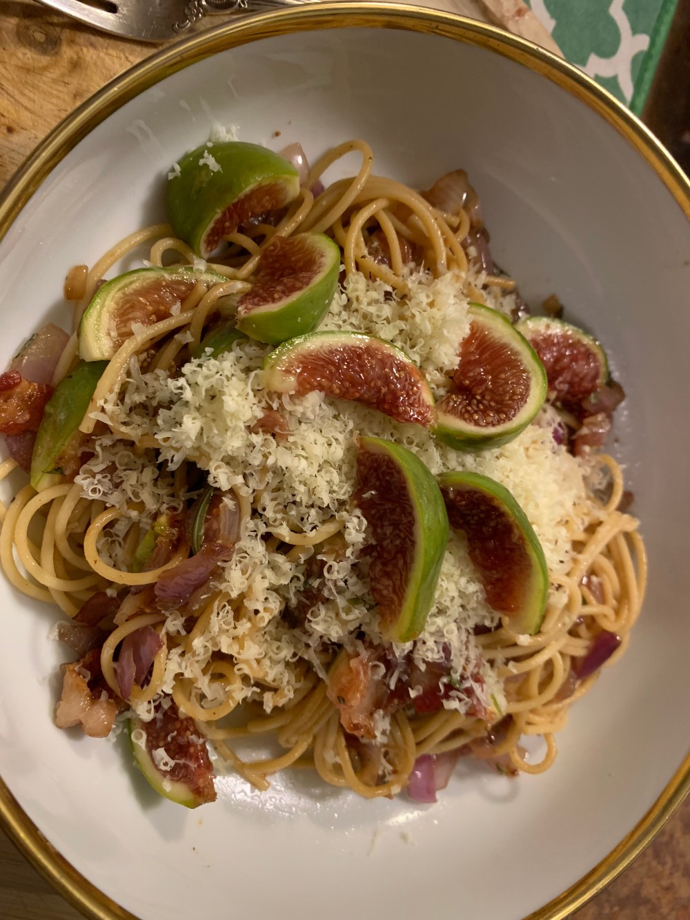 This simple pasta with figs, bacon, red onion and Parmesan was quite good. Another savory favorite of mine was a bestseller when I worked at Pasta and Co called Chicken and Figs! That recipe calls for dried black figs. I just picked some up and look forward to reporting back soon! Happy cooking!