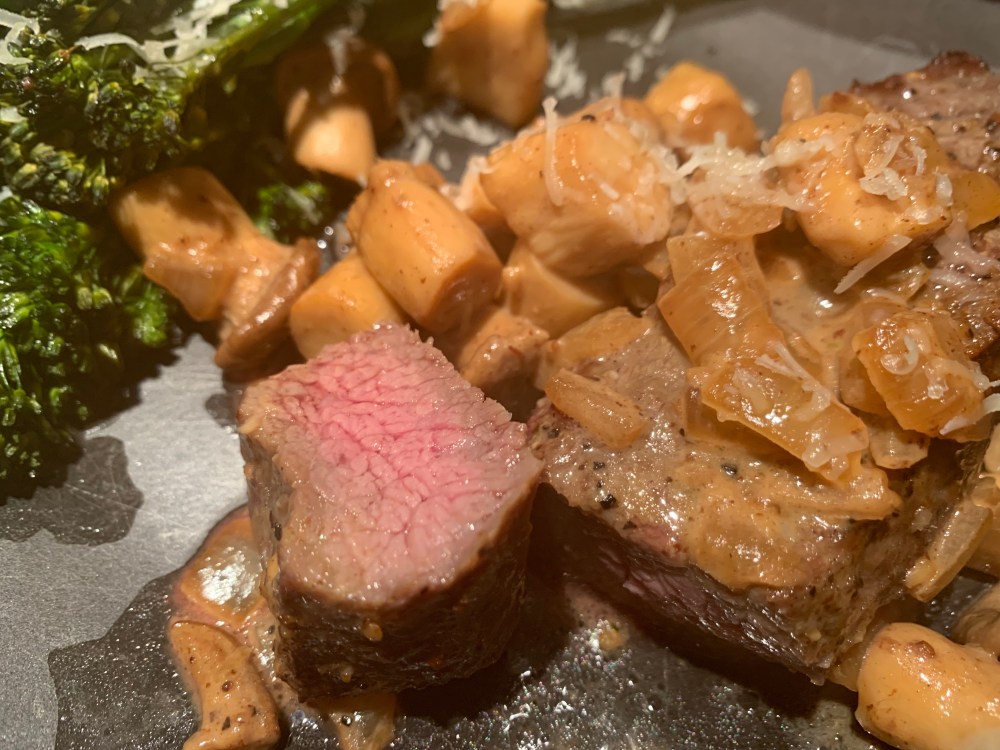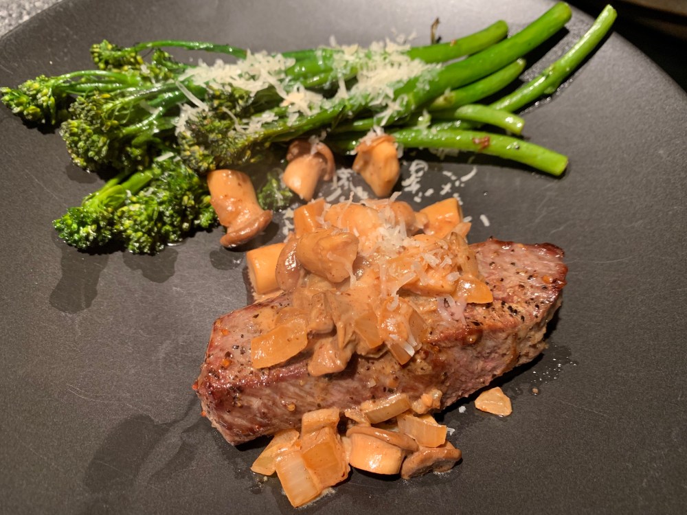 The pan you seared the steak in will have some nice drippings, sauté the onion in with them and scrape up the caramelized brown bits, add the mushroom and then deglaze with broth. Add heavy cream to thicken. Serve the sauce on the meat and dust the broccolini with Parmesan.
