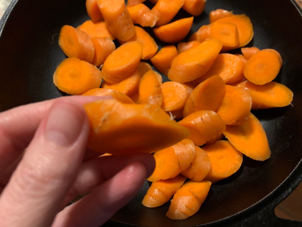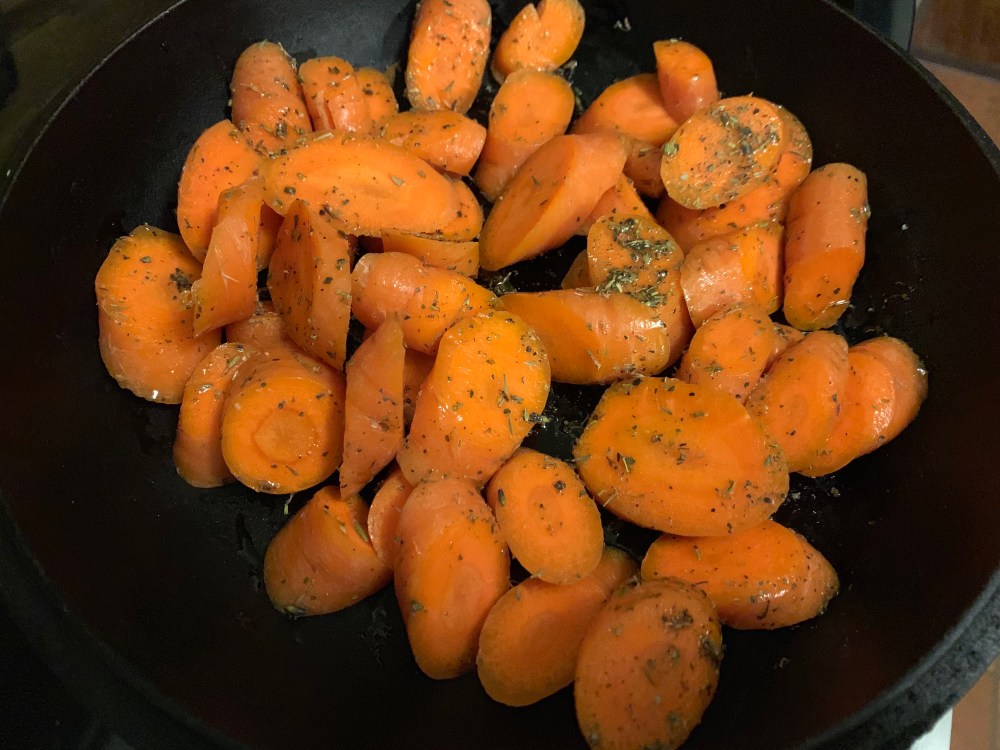 Preheat the oven to 400. Chop your carrots at a diagonal. Mix all the ingredients together and put into an oven safe pan. I love cast iron pans for this. Everything browns so nicely. Roast for about 40 minutes at 400, stirring once about half way through.