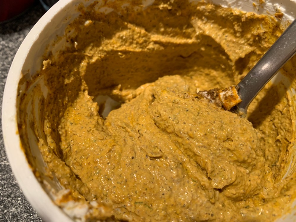 Start by mixing the yogurt, lemon juice, turmeric, garam masala and cumin together.