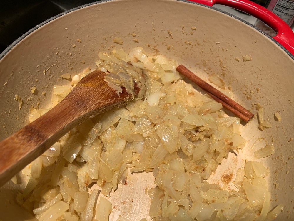 Dice the onion, garlic and grate the ginger. Melt the butter (or coconut oil) and then sauté the onion for a few minutes with the cinnamon stick, then add the garlic and ginger. Add the diced tomatoes to the skillet and a bit of salt and pepper.