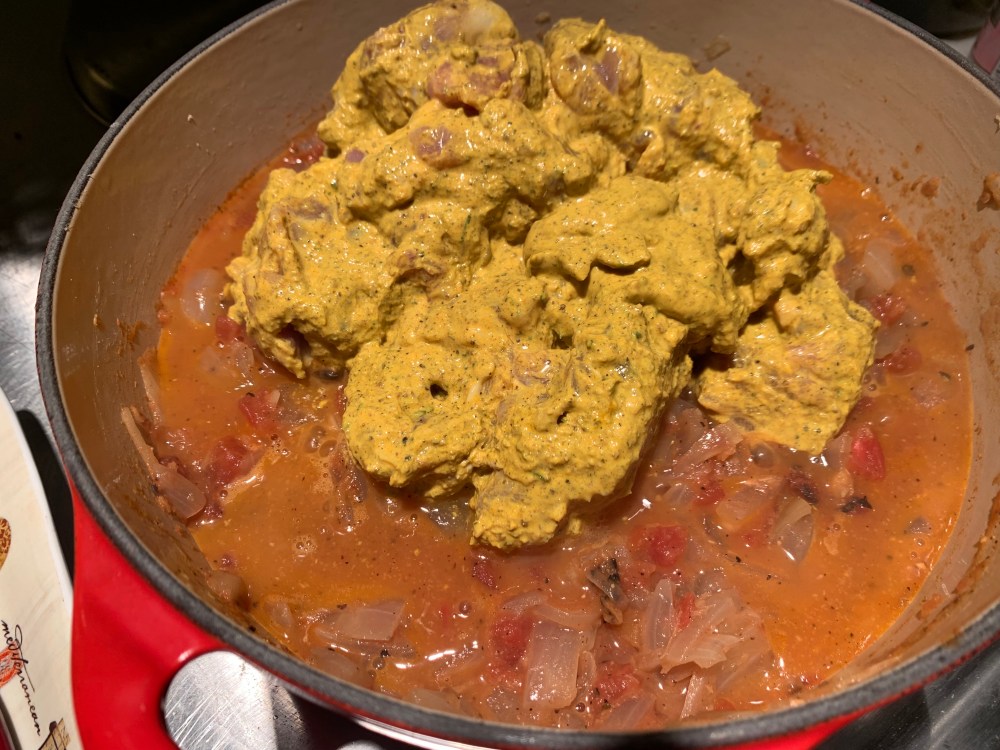 Add the marinated chicken and the excess yogurt marinade to the simmering tomato onion mixture. Stir in and simmer for 15 minutes. Add the can of coconut milk and simmer another 10 minutes. Makes sure the chicken is cooked through.